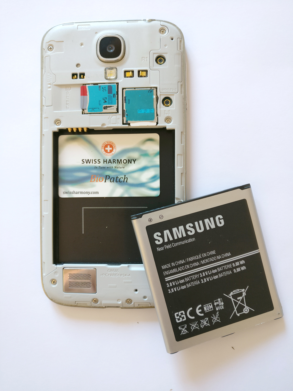 The majority of smartphones have a removable cover, which grants access to the battery compartment. In this case it is advisable to place the BioPatch under the cover. Optimal place: Under the battery.