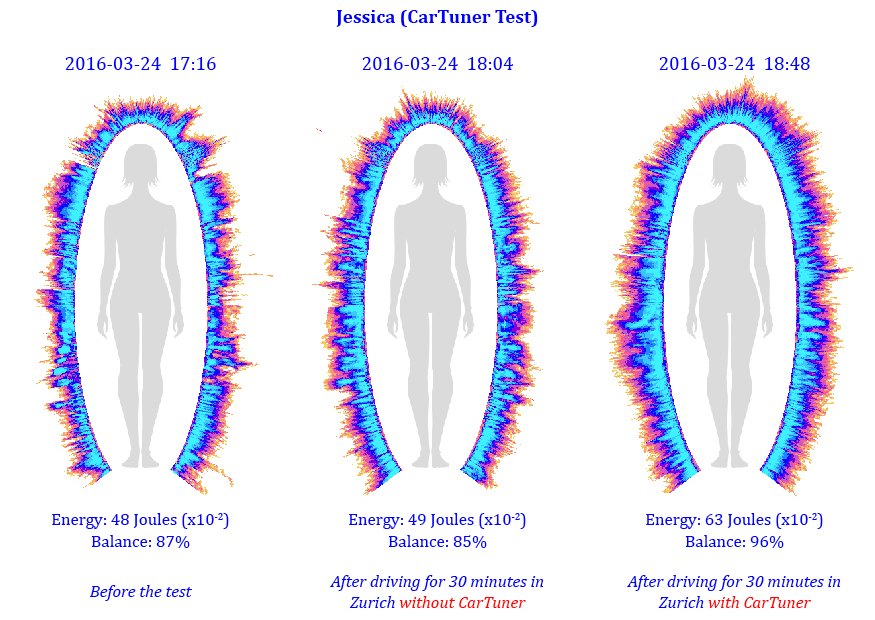 After the second drive, this time with the CarTuner, the differences are obvious: Jessica’s energy rose from 49 to 63 Joules and her overall balance increased by 11% to 96%.