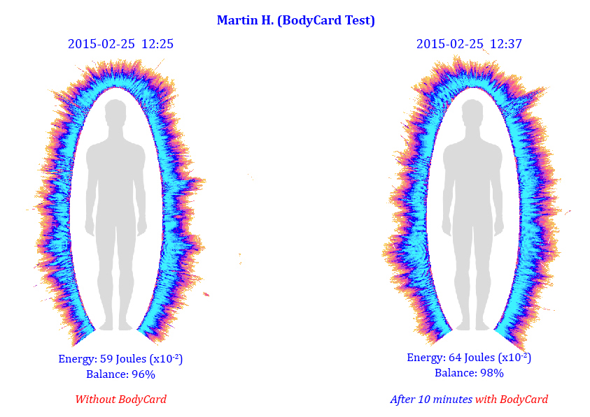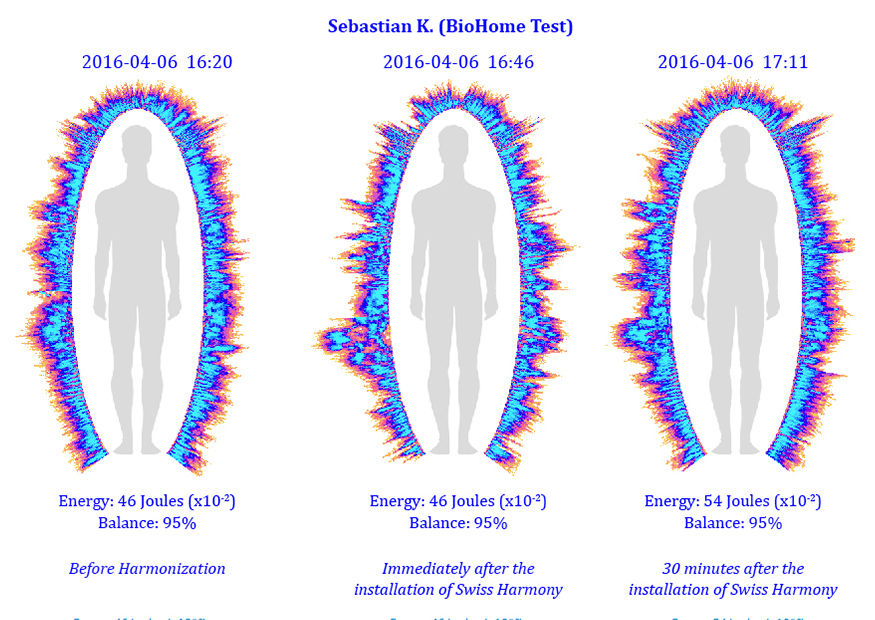 Sebastian already has an excellent overall balance, but the energy is surprisingly low. Immediately after the installation the measurement showed 46 Joules and 95% Balance. The only difference between test 1 and two is the distribution of the energy, which can be seen in the picture. A clear sign of energetic change.