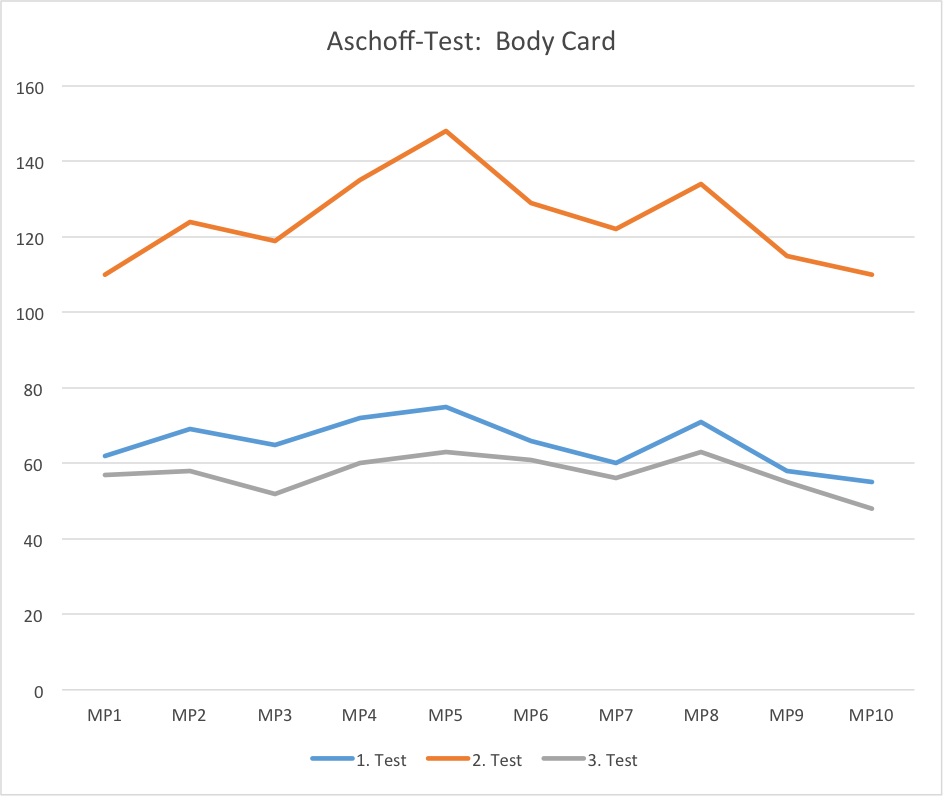The measured data of the third reading is unexpected low even though the proband is still exposed to the same electromagnetic contamination as at the second reading — but with the difference of carrying the Body Card in his trouser pocket. This allows only one conclusion: