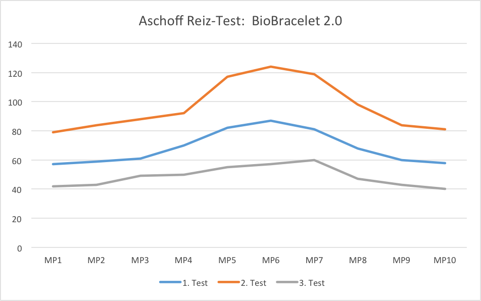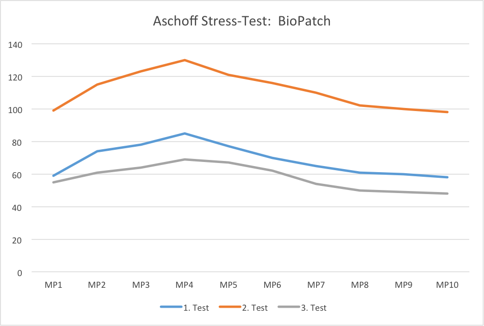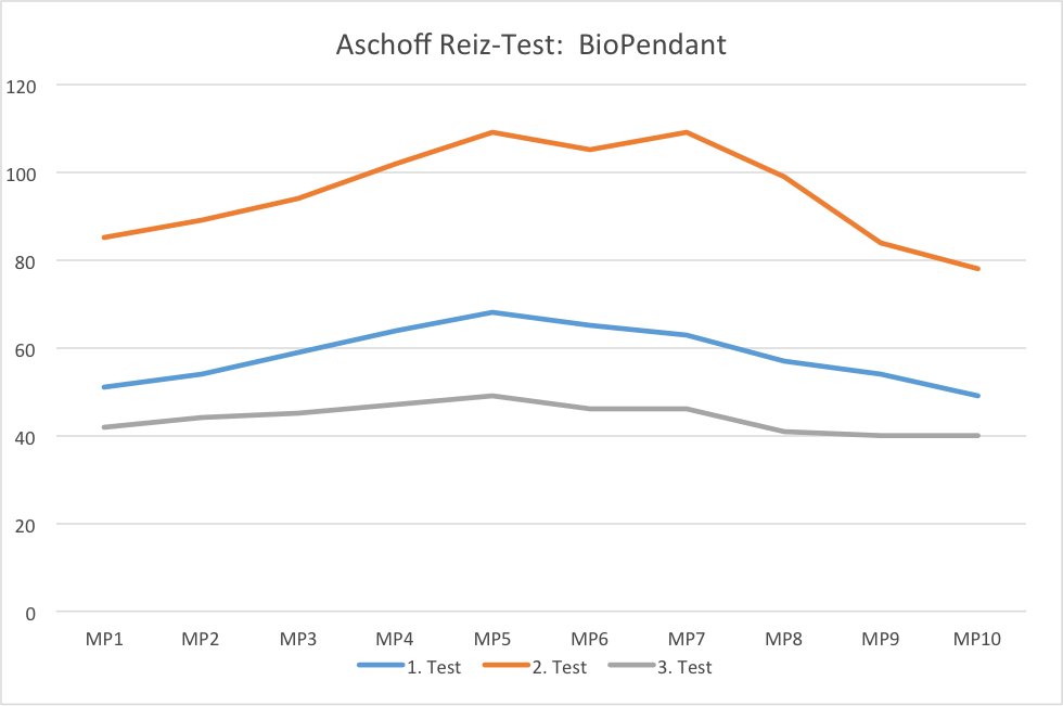 The measured data of the third reading with the BioPendant attached to the proband’s neck is surprisinly good. They run below the measured data without strain and without the BioPendant and almost reach the standard value. This allows only one conclusion: