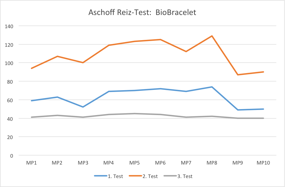 The measured data of the third reading is remarkable low even though the proband is still exposed to the same electromagnetic contamination as at the second reading — but with the difference of carrying the BioBracelet on his arm. The measured data are below the data of the first reading and almost reach the normal value of 40 kilo ohm. This allows only one conclusion: